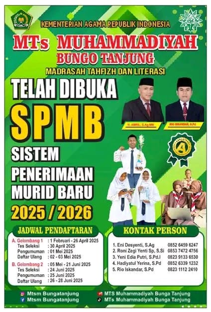 Bungo Tanjuang (14/03), Humas – TELAH DIBUKA !! Seleksi Penerimaan Murid Baru (SPMB) MTs Muhammadiyah Bungo Tanjung Tahun Pelajaran 2025/2026.